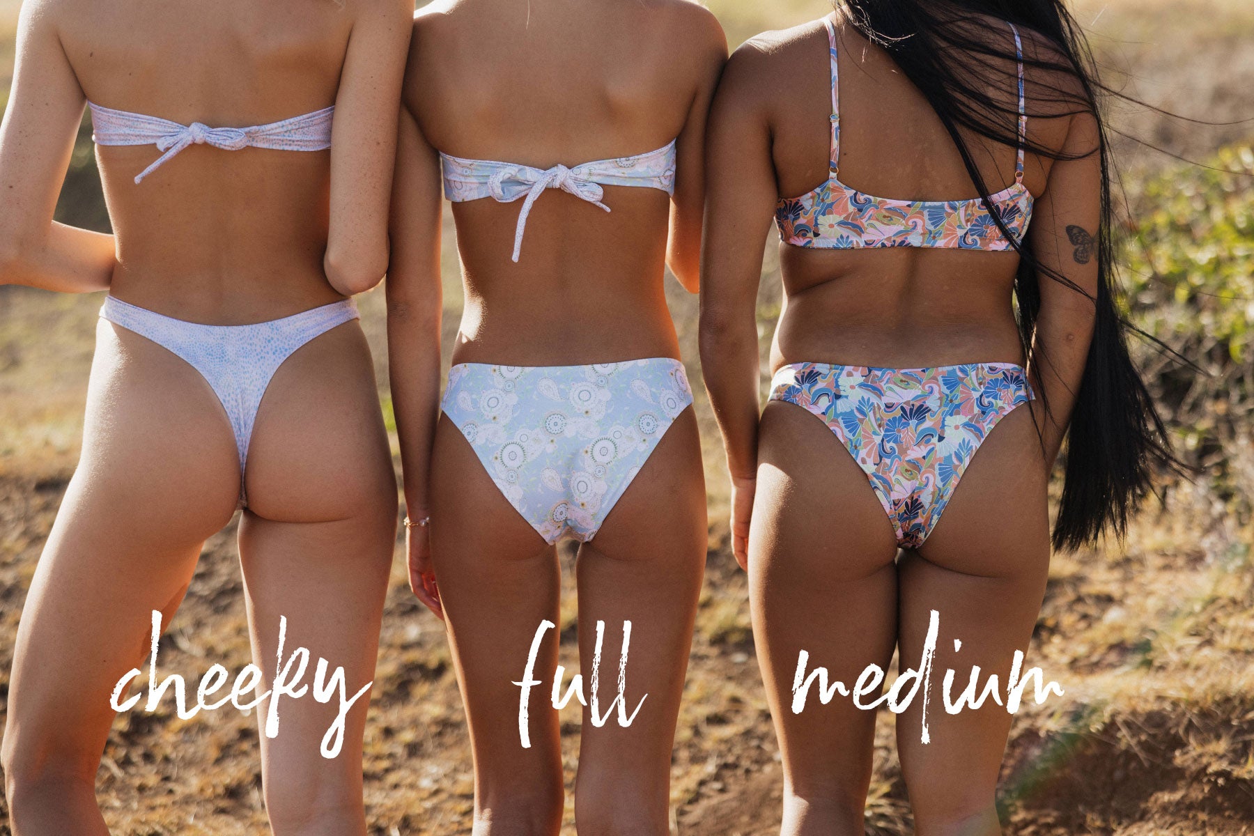 Meet our Banyans bottom in our Paze print! This style features two prints. The outside features our Paze print, while the inside features our Nahesa print, a beautiful taupe brown snake skin. This is the perfect classic adjustable side tie bottom offered in two coverage options- cheeky and medium.